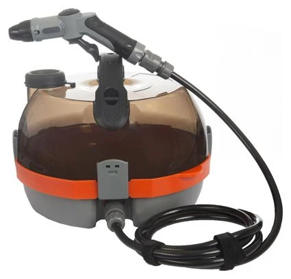 , siempre tendrá algo para limpiar su equipo, incluso cuando no esté en casa. Portátil, energéticamente eficiente y recargable, este limpiador tiene una batería integrada de 2200 mAh y un depósito con una capacidad máxima de 5 litros. No es necesario conectarse al agua o a la electricidad cuando se utiliza. Basta con montar el depósito y la base juntos, montar la manguera y luego llenar el depósito con agua.