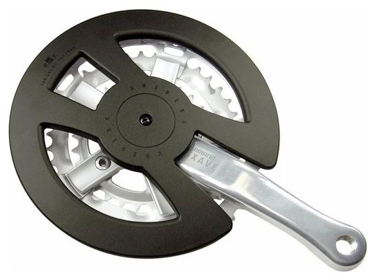 La primera carcasa redonda universal prácticamente irrompible con un diseño moderno. Detalles: Nuevo sistema de fijación de fibra de vidrio reforzada que se puede atornillar en el eje del cigüeñal. Apto para manivelas con rosca interior. La carcasa no entra en contacto con la platina. Fácil de montar y desmontar con tornillo central. Para platos de hasta 48 dientes. Dimensiones: 21x21cm Peso: 90g
