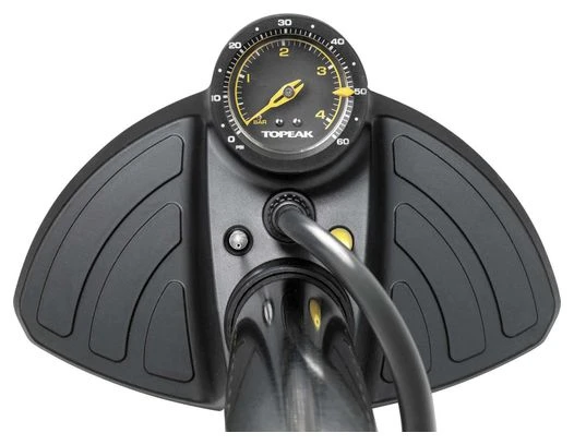 This unique mountain bike specific floor pump features a super-sized steel barrel designed to deliver the higher volume required for large off-road tires and an extra sensitive, base mounted analog gauge with air release button to help dial in the exact pressure.