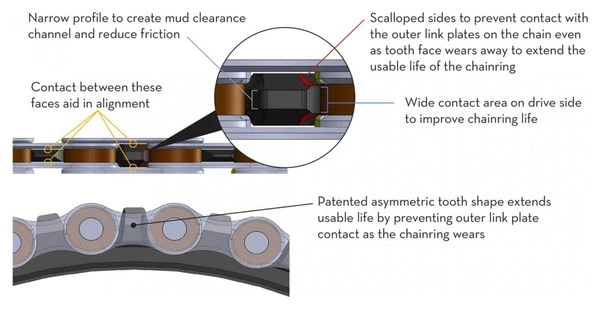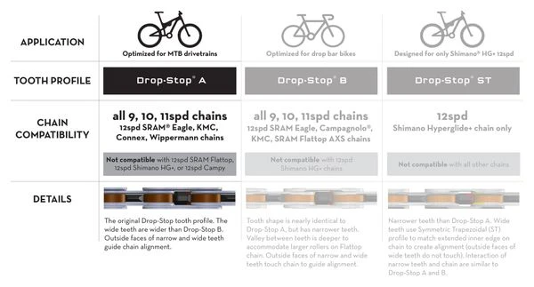 104 BCD es el patrón de pernos más común en juegos de bielas dobles y triples y resulta ser el primer producto fabricado con componentes Wolf Tooth. El diseño de diente Drop-Stop es el plato ancho / estrecho de mejor rendimiento y mayor duración del mercado. Principales características: Se adapta a cualquier juego de bielas 104 BCD. Tecnología Drop-Stop. En el plato ancho / estrecho patentado por Wolf Tooth, el lado ancho del diente tiene un contacto máximo en el lado de la transmisión, lo que distribuye la carga y mejora la vida del plato. El lado estrecho deja espacio libre para el barro y los escombros, lo que reduce la fricción. El patrón alternativo de dientes anchos / estrechos evita el descarrilamiento de la cadena. Características: Perfil de diente: Drop-Stop A. Pesos: 36 g (30T). Material: aluminio 7075-T6. Fabricado en EE. UU. Compatibilidad: Compatible con cualquier juego de bielas 104 BCD. El perfil de diente ancho / estrecho Drop-Stop patentado por Wolf Tooth para la máxima retención de la cadena y capacidad de eliminación de lodo. Todos los tamaños de anillos requieren tornillos 1x de 6 mm de largo. Si usa un anillo de protección, necesitará pernos de 8 mm (la mayoría de los pernos originales en los juegos de bielas 3x son de 8 mm). Todos los tamaños de platos 104 BCD son compatibles con los medidores de potencia Quarq. El 30T tiene una muesca de alivio para cumplir con los requisitos de diámetro interno mínimo del medidor de potencia Quarq. Compatible con transmisiones 1×9, 1×10, 1×11 y 1×12. Si usa un tren motriz de 9 velocidades, use una cadena de 10 velocidades (cambia y funciona bien en un tren motriz de 9 velocidades y se ajusta más apretado al anillo para una mejor retención de la cadena). Disponible en dos perfiles de dientes diferentes para un rendimiento óptimo según el tipo de cadena. Use Drop-Stop ST para usar con cadenas Shimano Hyperglide + de 12 velocidades. Utilice Drop-Stop A para todas las cadenas de 9, 10 y 11 velocidades o cadenas Sram Eagle, KMC, Connex o Wippermann de 12 velocidades. NO es compatible con Sram Flattop de 12 velocidades, Shimano HG + de 12 velocidades o Campagnolo de 12 velocidades. Recomendaciones: Si planea conducir en condiciones muy embarradas, le recomendamos un guía de cadena o guardacadena además de un desviador trasero de tipo embrague. Sin estas precauciones, puede experimentar caídas de cadena y / o succión de cadena.