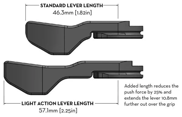 Si su publicación no aparece en las tablas de «Compatibilidad de ReMote», mida el centro de pivote hasta el final de su palanca actual. Si es superior a 52 mm, Light Action funcionará mejor. Si es inferior a 52 mm, el ReMote estándar funcionará mejor.